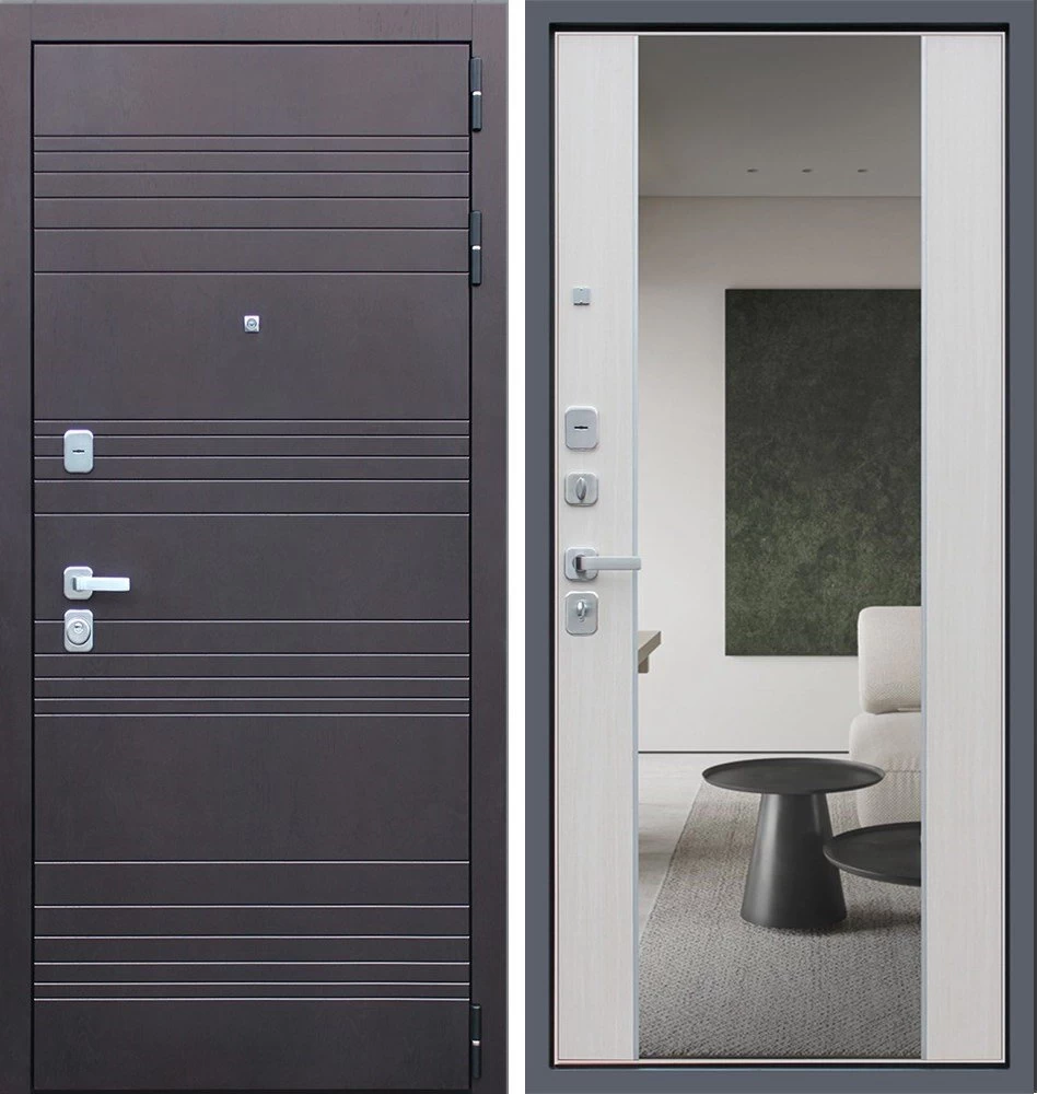 Надежная входная Дверь Дуэт с зеркалом премиум класса по цене 42 750 руб. Большая толщина стали защитит от проникновения в ваш дом, квартиру или коттедж. Используется очень качественная фурнитура: замки, цилиндры, ручки, защелки. Покрытие и отделка двери изготовлено под внимательным контролем производителя. Дверь имеет долгий срок службы и гарантию.